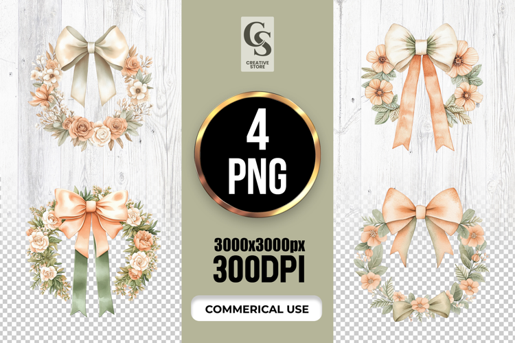 4 Watercolor Floral Wreath Bow Clipart Sublimation PNG Files Perfect for Greeting Cards, Invitations, Junk Journal, Party Decor, Scrapbooking and many other craft projects.