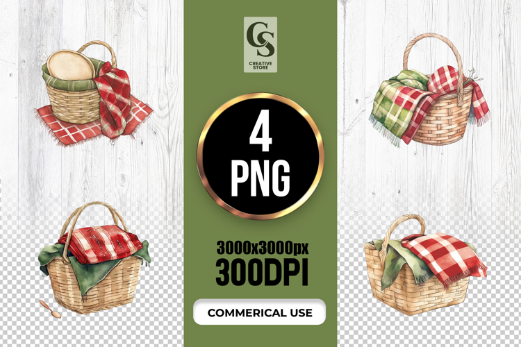 4 Picnic Basket Watercolor Clipart Sublimation PNG Files Perfect for Greeting Cards, Invitations, Junk Journal, Party Decor, Scrapbooking and many other craft projects.