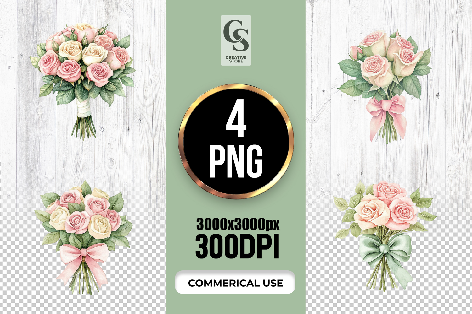 4 Watercolor Rose Bouquet Clipart PNG Files Perfect for Greeting Cards, Invitations, Junk Journal, Party Decor, Scrapbooking and many other craft projects.