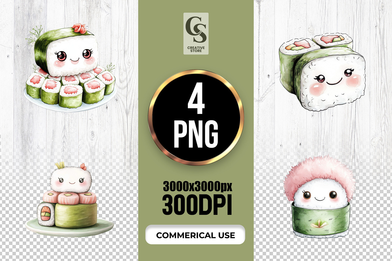 4 Cute Kawaii Sushi Clipart PNG Files Perfect for Greeting Cards, Invitations, Junk Journal, Party Decor, Scrapbooking and many other craft projects.