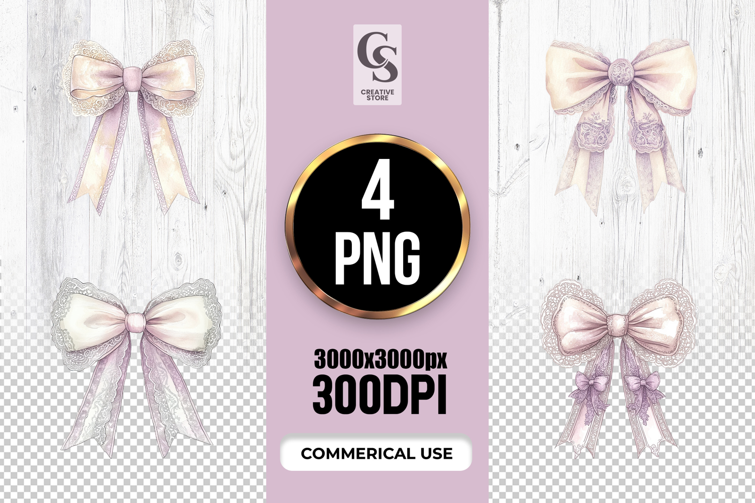 4 Vintage Lace Bow Ribbon Illustration Clipart Sublimation PNG Files Perfect for Greeting Cards, Invitations, Junk Journal, Party Decor, Scrapbooking and many other craft projects.