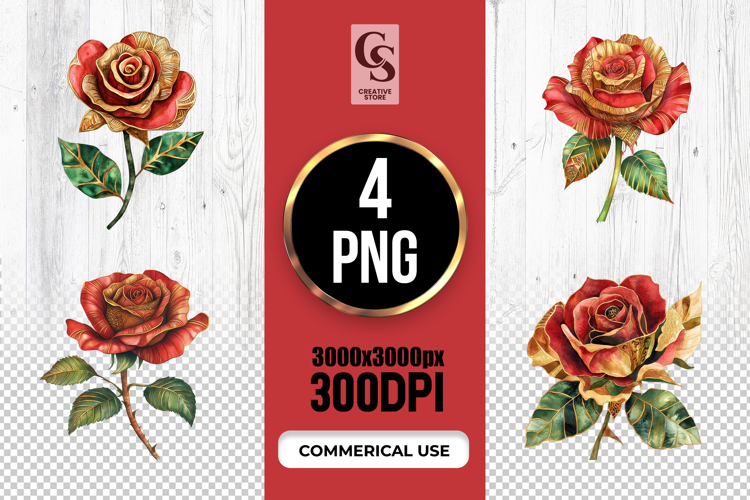 4 Vintage Red Rose Floral Illustration Clipart Sublimation PNG Files Perfect for Greeting Cards, Invitations, Junk Journal, Party Decor, Scrapbooking and many other craft projects.