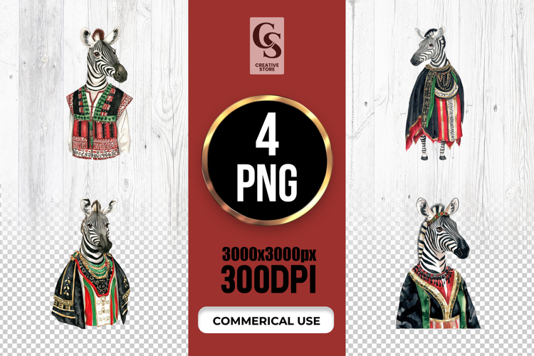 4 Zebra Traditional Costume Watercolor Clipart Sublimation PNG Files Perfect for Greeting Cards, Invitations, Junk Journal, Party Decor, Scrapbooking and many other craft projects.