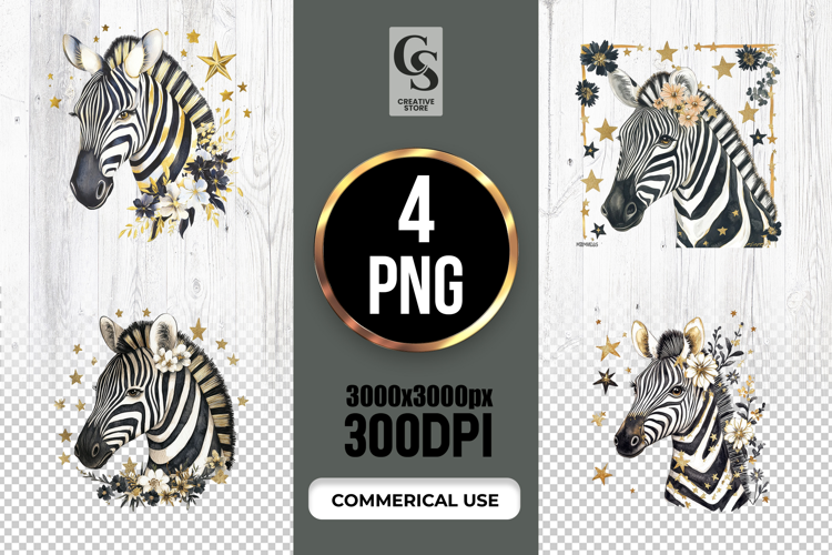 4 Gold Star Zebra Floral Watercolor Clipart Sublimation PNG Files Perfect for Greeting Cards, Invitations, Junk Journal, Party Decor, Scrapbooking and many other craft projects.