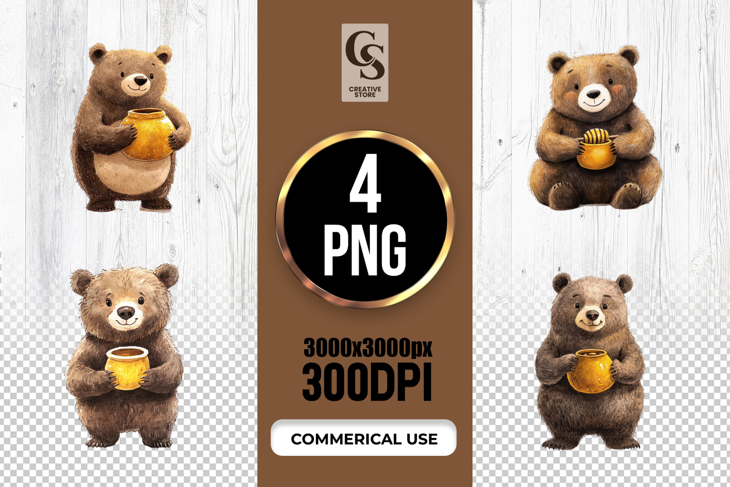 4 Cute Bear With Honey Clipart Sublimation PNG Files Perfect for Greeting Cards, Invitations, Junk Journal, Party Decor, Scrapbooking and many other craft projects.