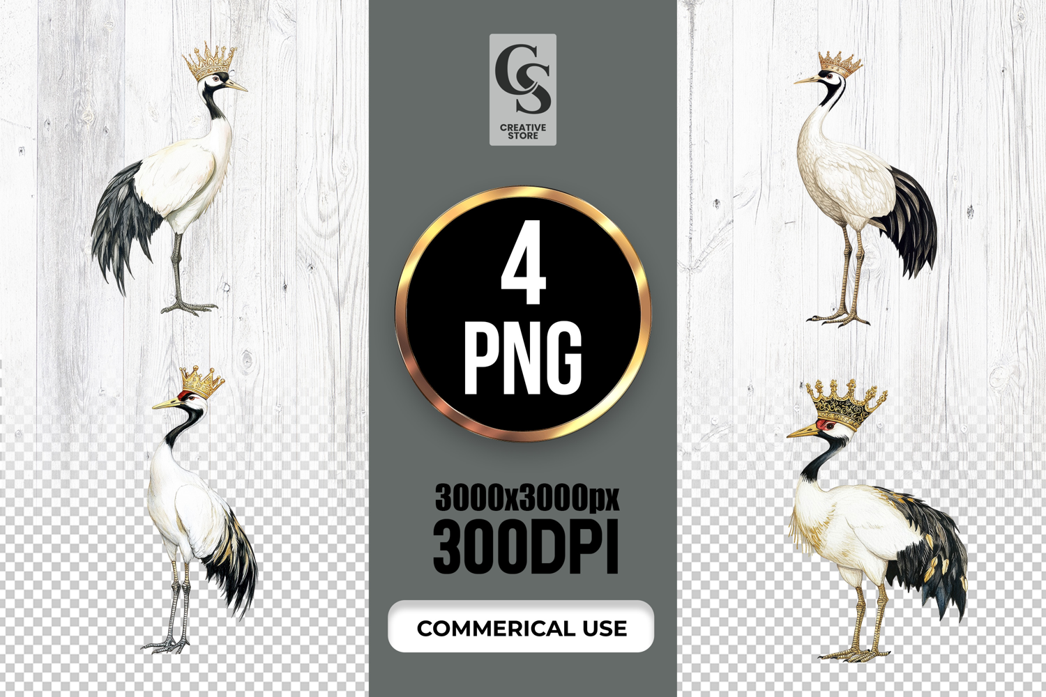 4 Crowned Crane Watercolor Clipart Sublimation PNG Files Perfect for Greeting Cards, Invitations, Junk Journal, Party Decor, Scrapbooking and many other craft projects.