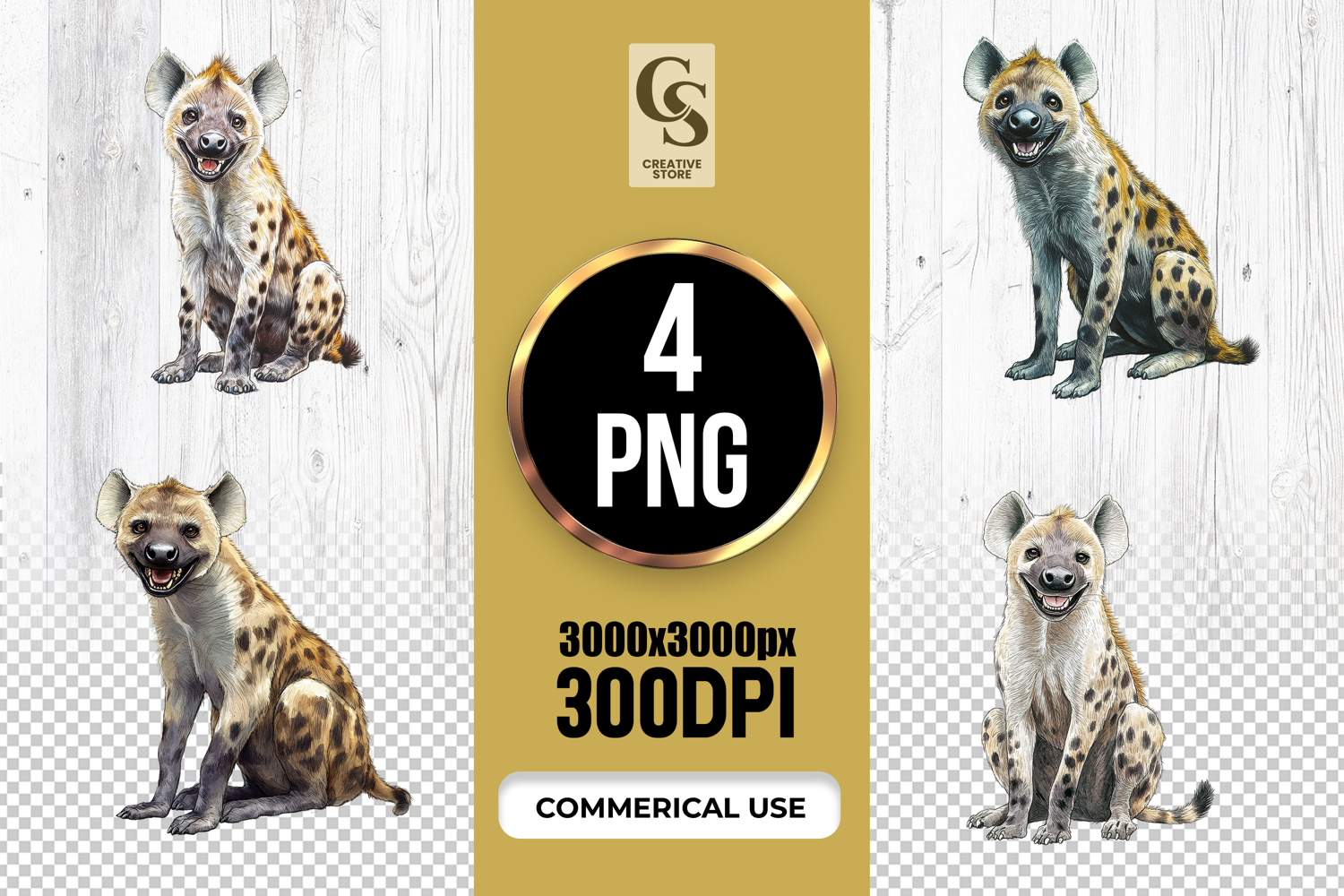 4 Watercolor Hyena Clipart Sublimation PNG Files Perfect for Greeting Cards, Invitations, Junk Journal, Party Decor, Scrapbooking and many other craft projects.