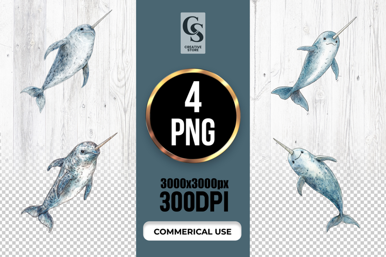 4 Watercolor Narwhal Illustration Clipart Sublimation PNG Files Perfect for Greeting Cards, Invitations, Junk Journal, Party Decor, Scrapbooking and many other craft projects.