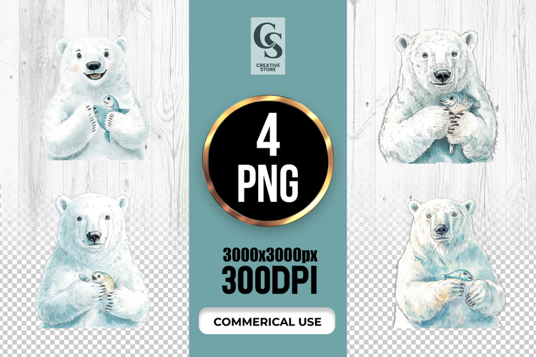 4 Watercolor Polar Bear Illustration Clipart Sublimation PNG Files Perfect for Greeting Cards, Invitations, Junk Journal, Party Decor, Scrapbooking and many other craft projects.