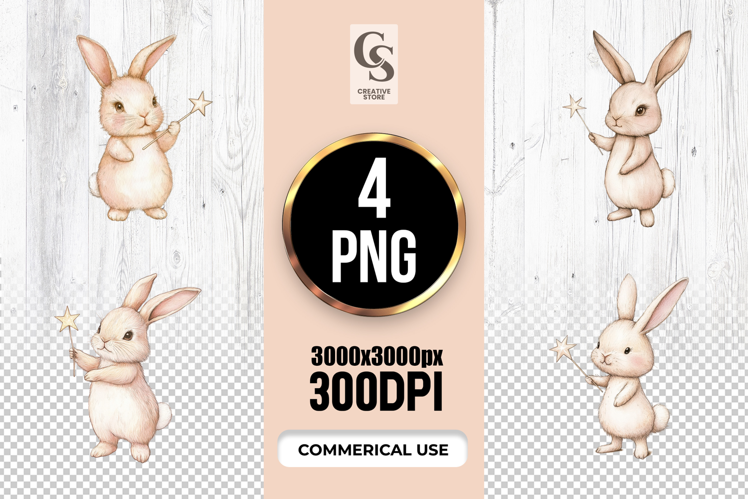 4 Watercolor Bunny With Wand Clipart Sublimation PNG Files Perfect for Greeting Cards, Invitations, Junk Journal, Party Decor, Scrapbooking and many other craft projects.