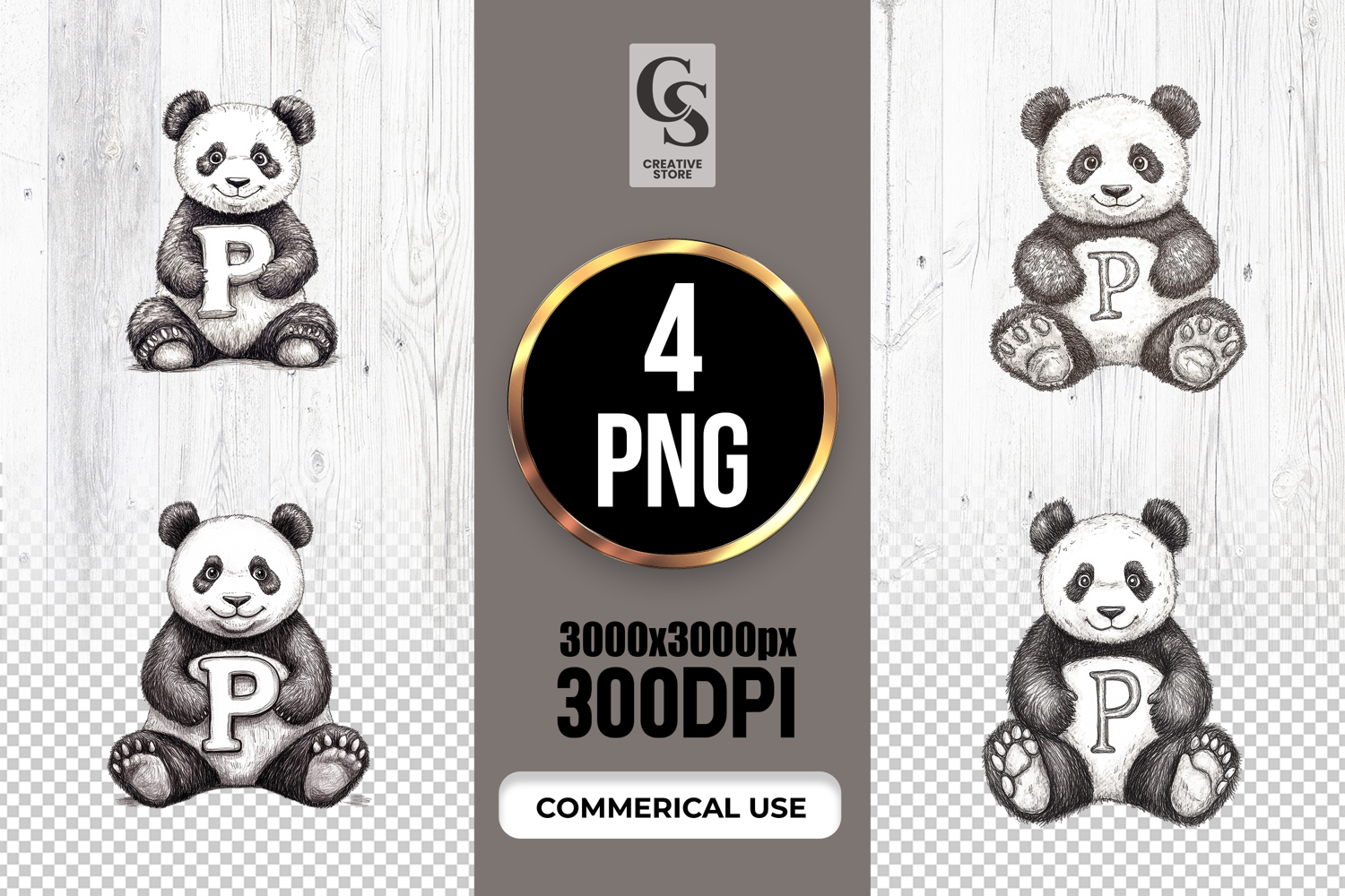 4 P Panda Alphabet Letter Watercolor Clipart Sublimation PNG Files Perfect for Greeting Cards, Invitations, Junk Journal, Party Decor, Scrapbooking and many other craft projects.