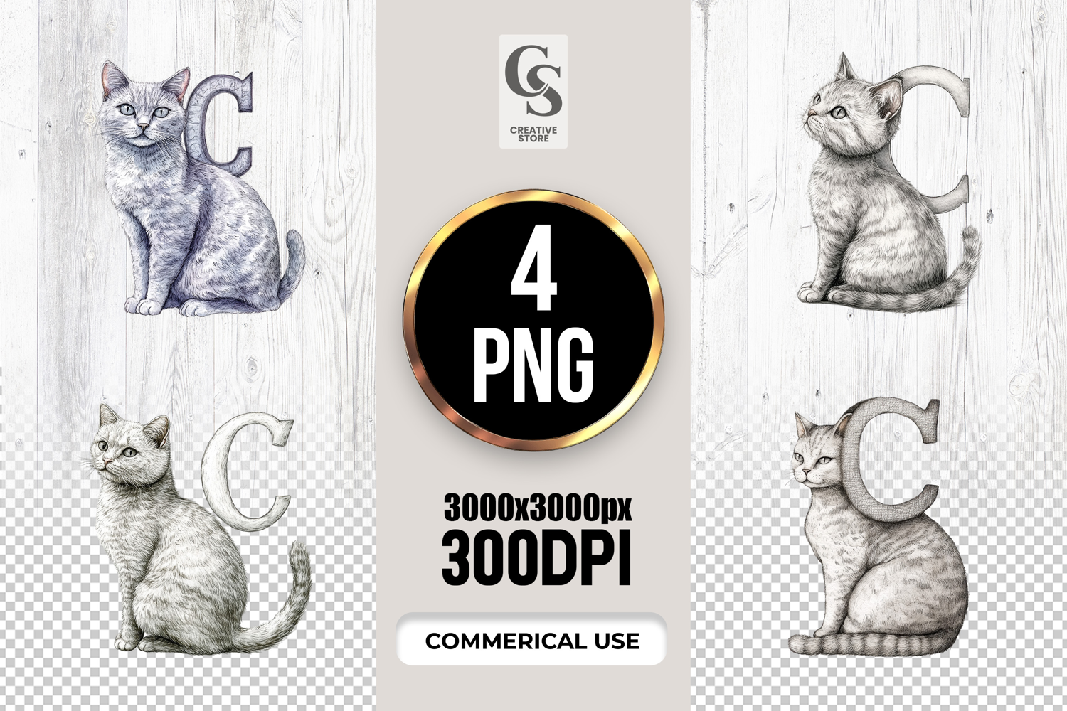 4 C Cat Alphabet Letter Watercolor Clipart Sublimation PNG Files Perfect for Greeting Cards, Invitations, Junk Journal, Party Decor, Scrapbooking and many other craft projects.