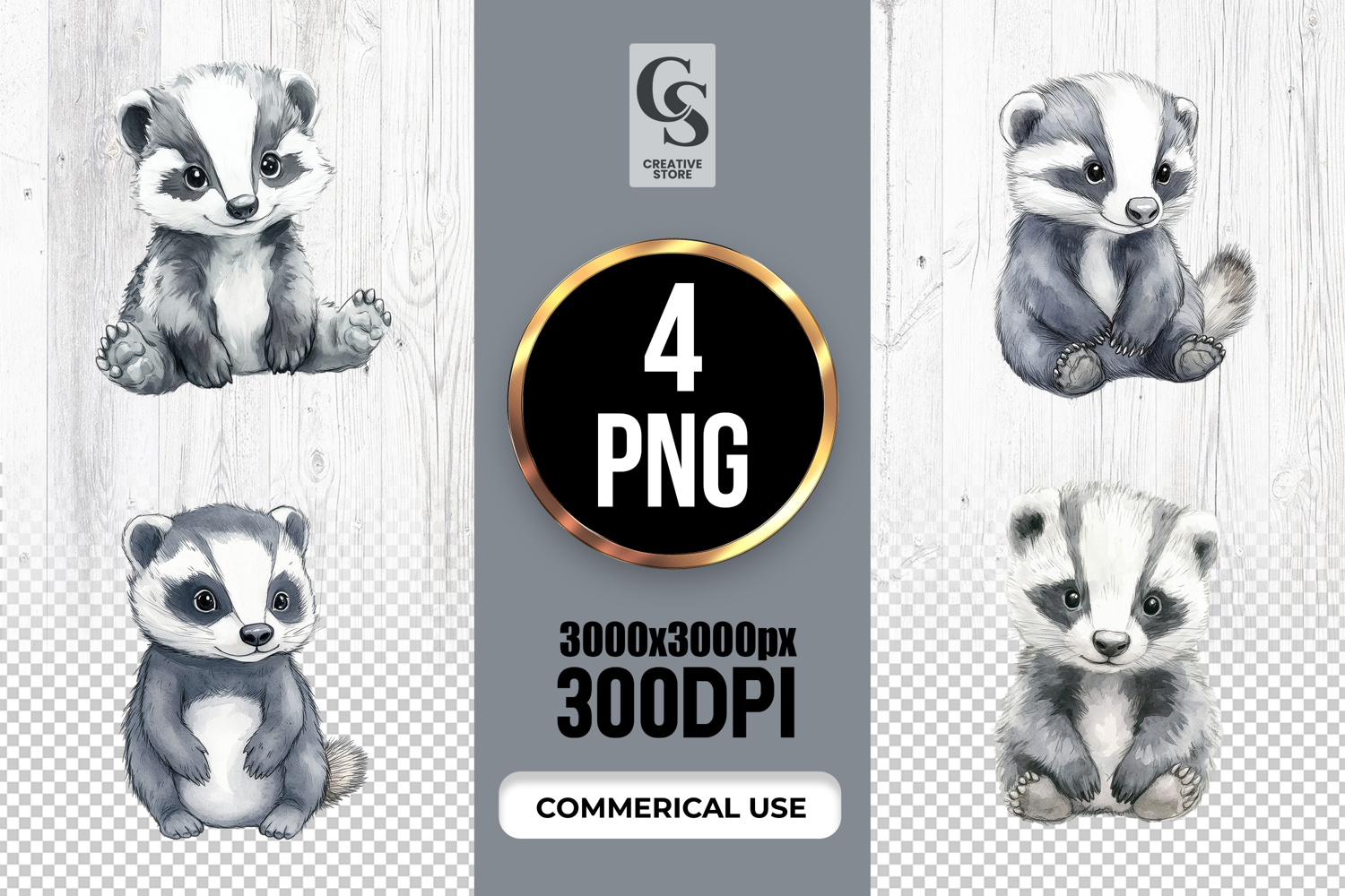 4 Watercolor Baby Badger Clipart Sublimation PNG Files Perfect for Greeting Cards, Invitations, Junk Journal, Party Decor, Scrapbooking and many other craft projects.