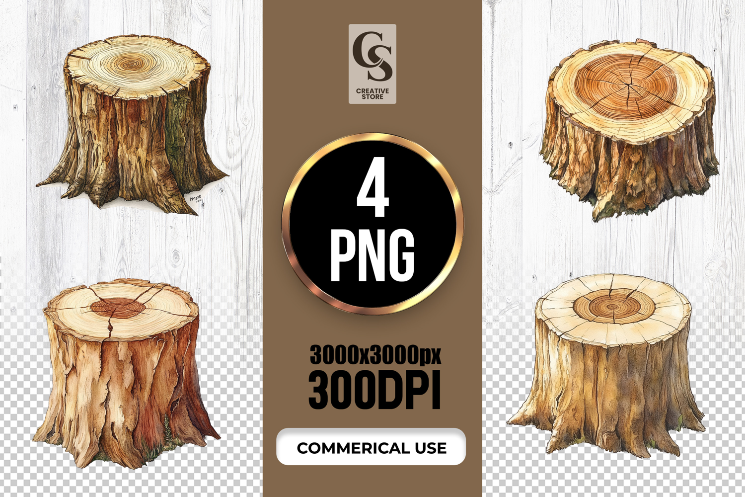4 Watercolor Tree Stump Illustration Clipart Sublimation PNG Files Perfect for Greeting Cards, Invitations, Junk Journal, Party Decor, Scrapbooking and many other craft projects.