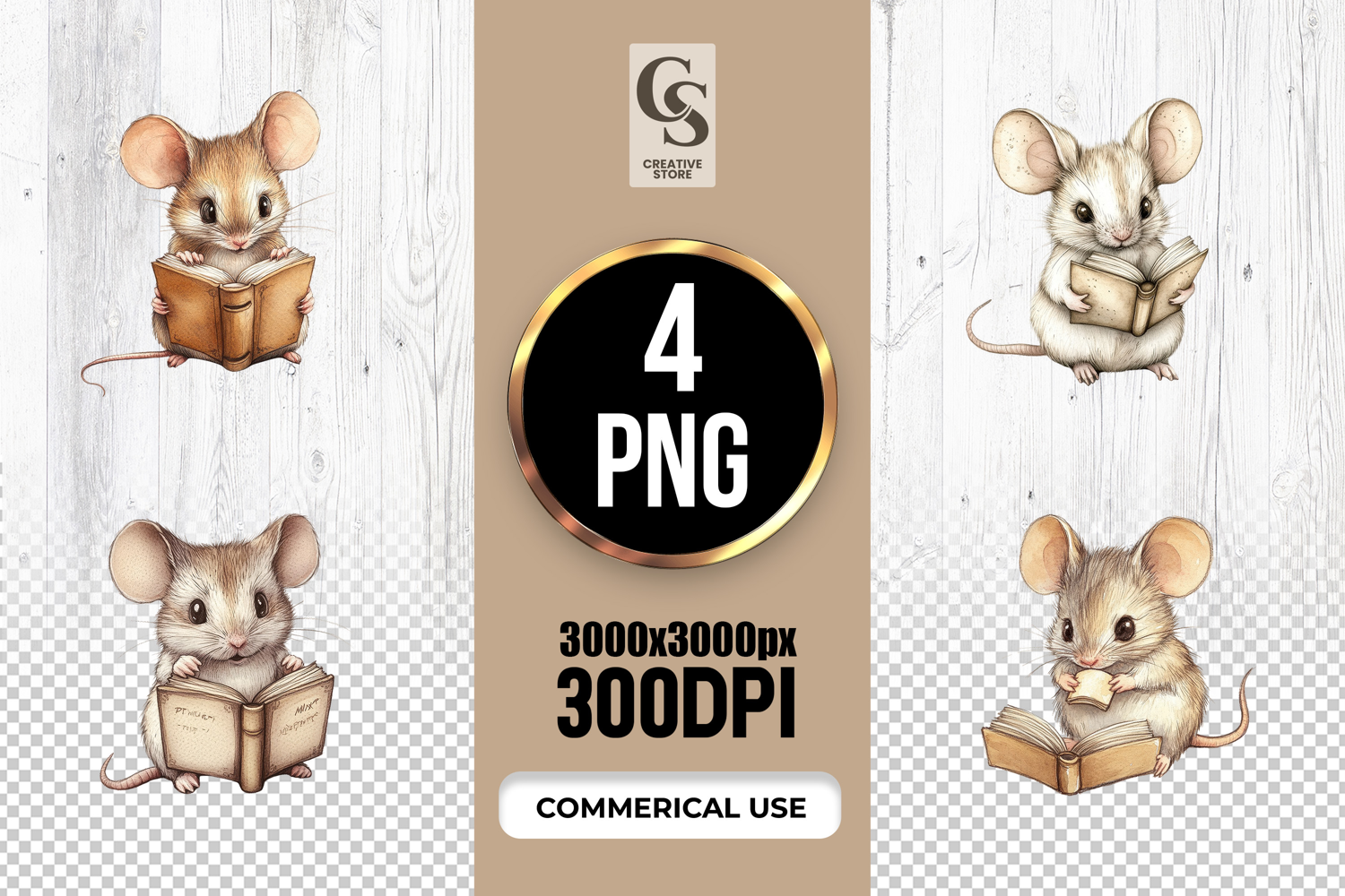 4 Reading Mouse Watercolor Clipart Sublimation PNG Files Perfect for Greeting Cards, Invitations, Junk Journal, Party Decor, Scrapbooking and many other craft projects.