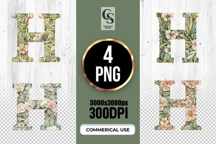 4 Floral Letter H Watercolor Monogram Clipart Sublimation PNG Files Perfect for Greeting Cards, Invitations, Junk Journal, Party Decor, Scrapbooking and many other craft projects.