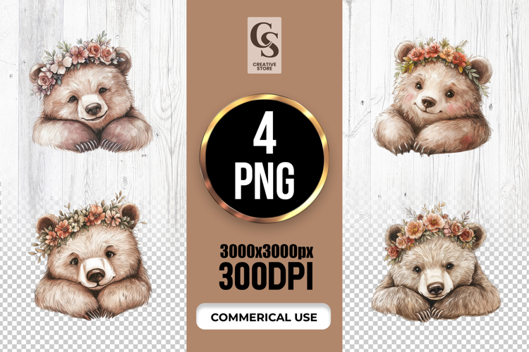 4 Cute Bear with Flower Crown Watercolor Clipart PNG Files Perfect for Greeting Cards, Invitations, Junk Journal, Party Decor, Scrapbooking and many other craft projects.