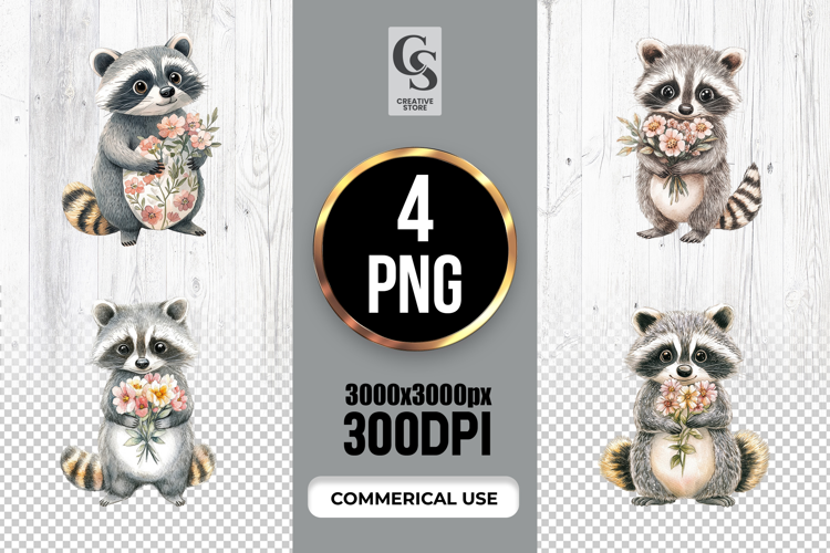 4 Cute Raccoon with Flowers Watercolor Clipart Sublimation PNG Files Perfect for Greeting Cards, Invitations, Junk Journal, Party Decor, Scrapbooking and many other craft projects.