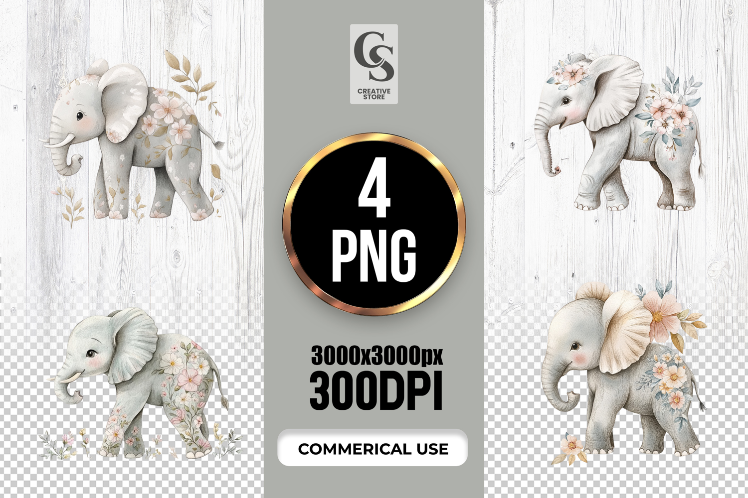 4 Cute Watercolor Elephant Clipart Sublimation PNG Files Perfect for Greeting Cards, Invitations, Junk Journal, Party Decor, Scrapbooking and many other craft projects.