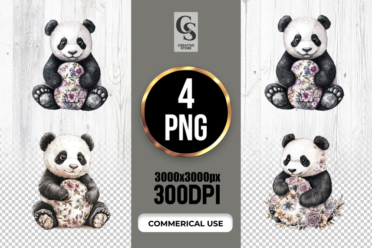 4 Floral Watercolor Panda Clipart Sublimation PNG Files Perfect for Greeting Cards, Invitations, Junk Journal, Party Decor, Scrapbooking and many other craft projects.