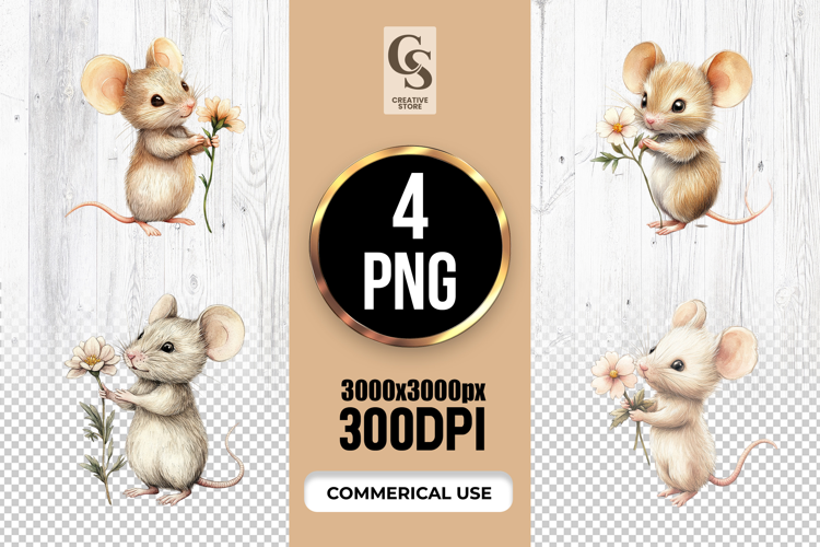 4 Cute Watercolor Mouse With Flower Clipart Sublimation PNG Files Perfect for Greeting Cards, Invitations, Junk Journal, Party Decor, Scrapbooking and many other craft projects.