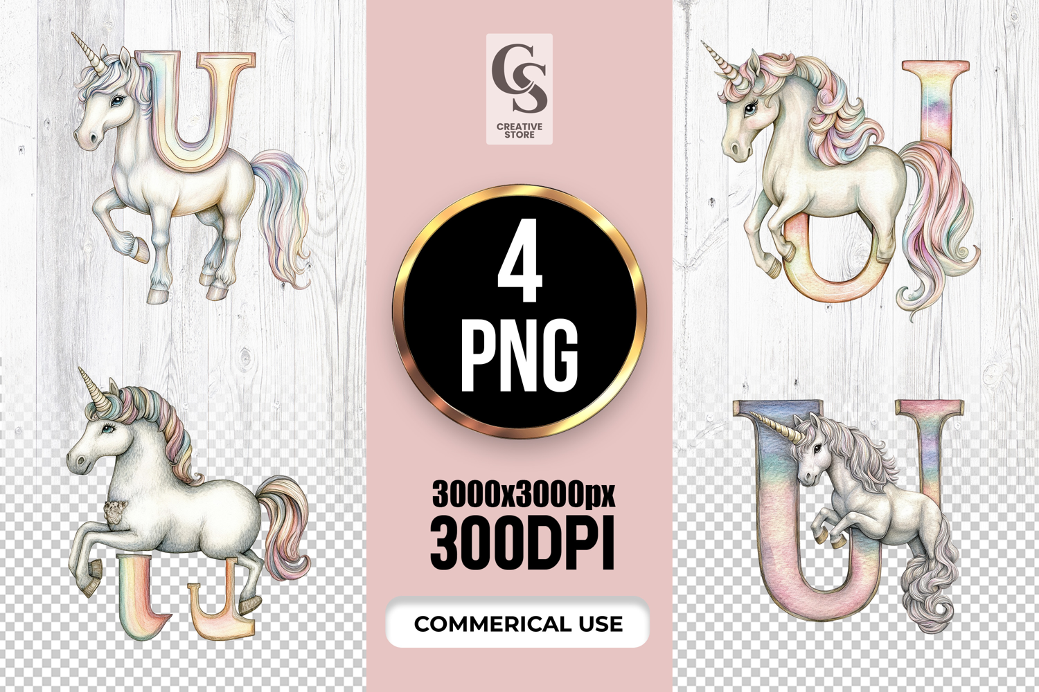 4 Watercolor Unicorn Alphabet Letter U Clipart Sublimation PNG Files Perfect for Greeting Cards, Invitations, Junk Journal, Party Decor, Scrapbooking and many other craft projects.