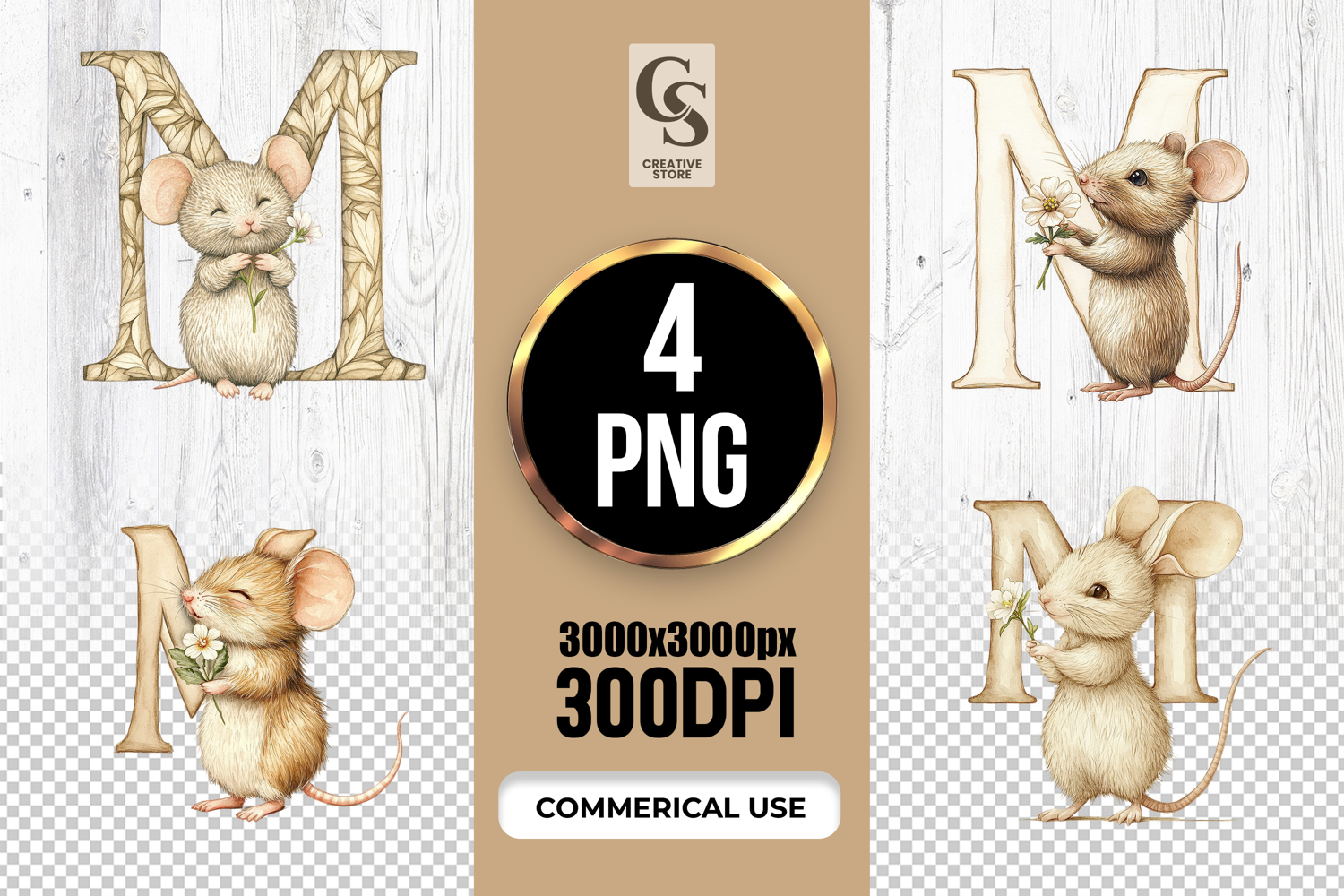 4 Cute Mouse Alphabet Letter M Clipart Sublimation PNG Files Perfect for Greeting Cards, Invitations, Junk Journal, Party Decor, Scrapbooking and many other craft projects.