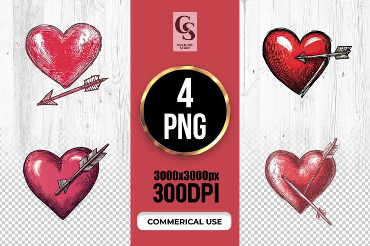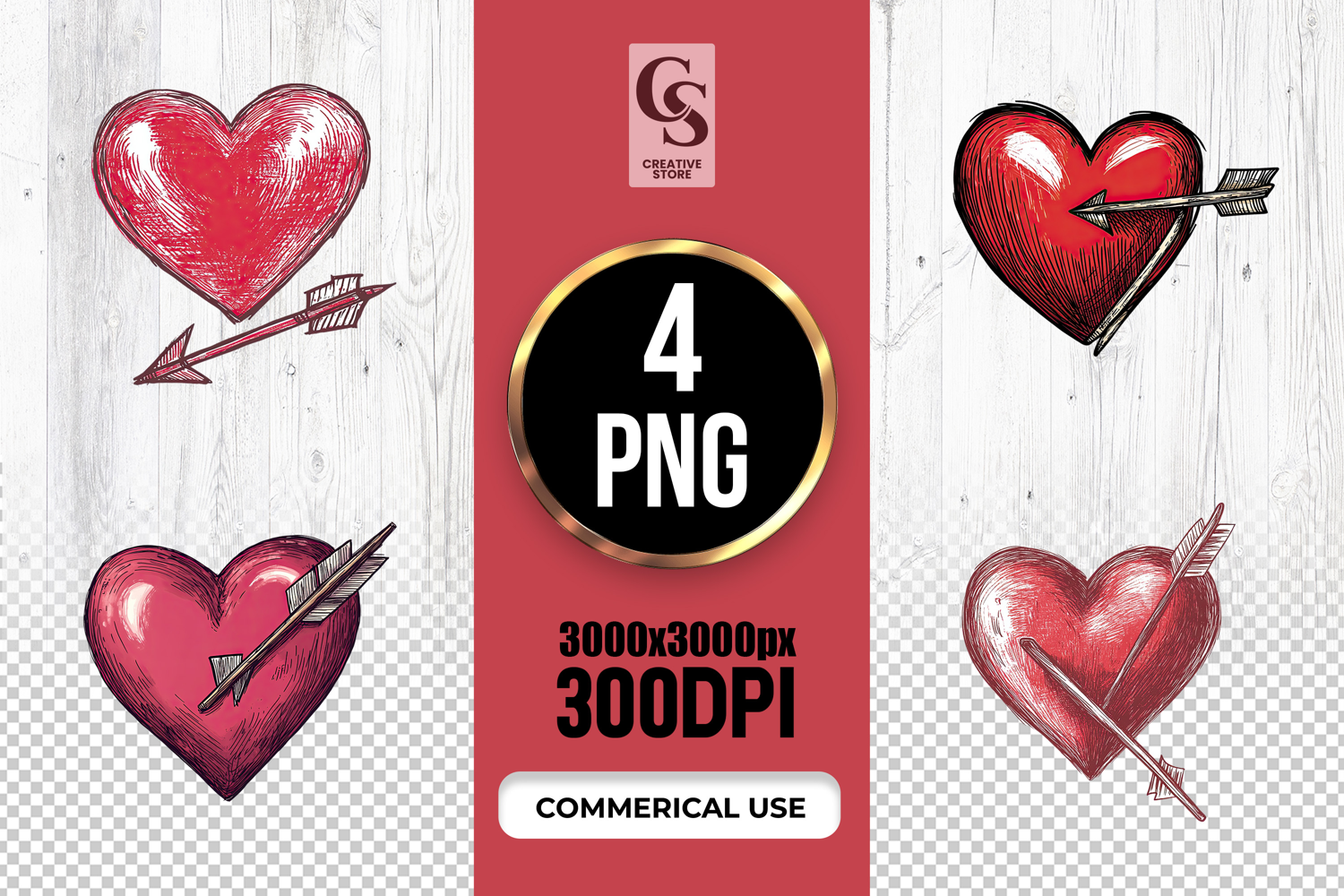 4 Hand Drawn Heart With Arrow Illustration Clipart png Files Perfect for Greeting Cards, Invitations, Junk Journal, Party Decor, Scrapbooking and many other craft projects.