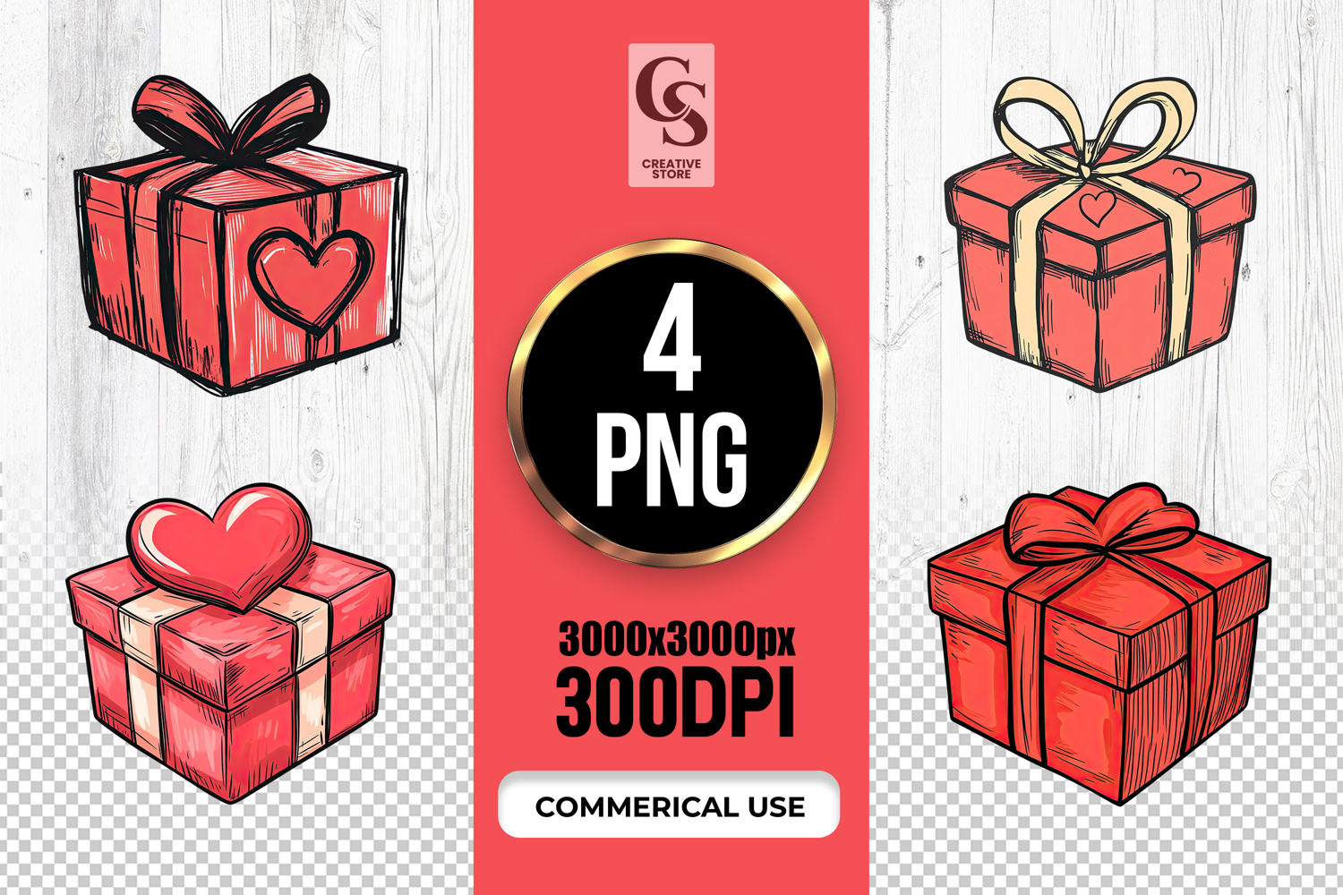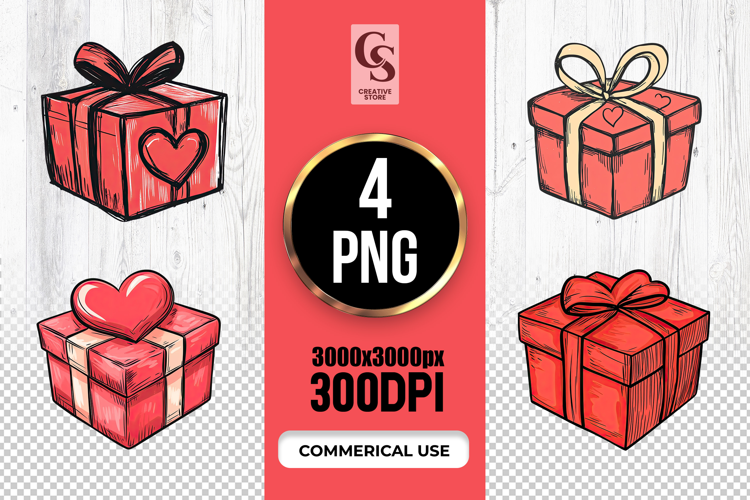 4 Hand Drawn Gift Box With Heart Clipart Sublimation PNG Files Perfect for Greeting Cards, Invitations, Junk Journal, Party Decor, Scrapbooking and many other craft projects.