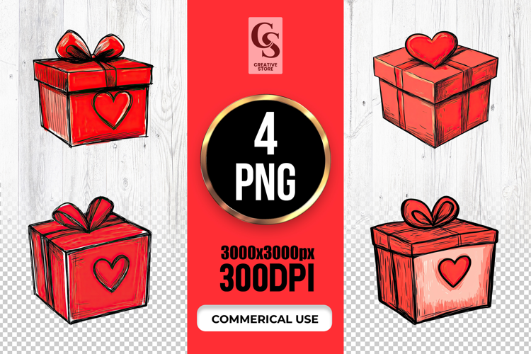 4 Hand Drawn Heart Gift Box Clipart Sublimation PNG Files Perfect for Greeting Cards, Invitations, Junk Journal, Party Decor, Scrapbooking and many other craft projects.