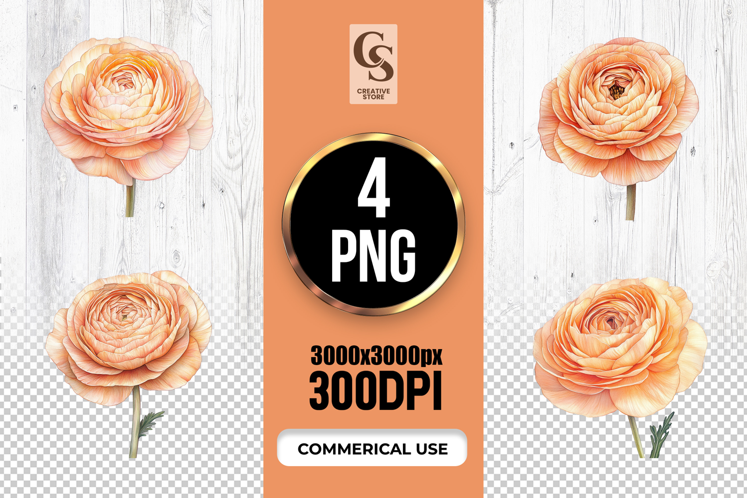 4 Peach Ranunculus Flower Illustration Clipart Sublimation PNG Files Perfect for Greeting Cards, Invitations, Junk Journal, Party Decor, Scrapbooking and many other craft projects.