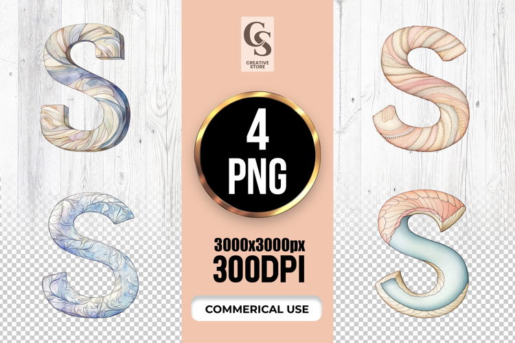 4 Fantasy Letter S Watercolor Alphabet Clipart Sublimation PNG Files Perfect for Greeting Cards, Invitations, Junk Journal, Party Decor, Scrapbooking and many other craft projects.