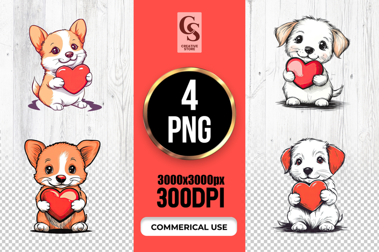 4 Cute Puppies Holding Heart Clipart Sublimation PNG Files Perfect for Greeting Cards, Invitations, Junk Journal, Party Decor, Scrapbooking and many other craft projects.