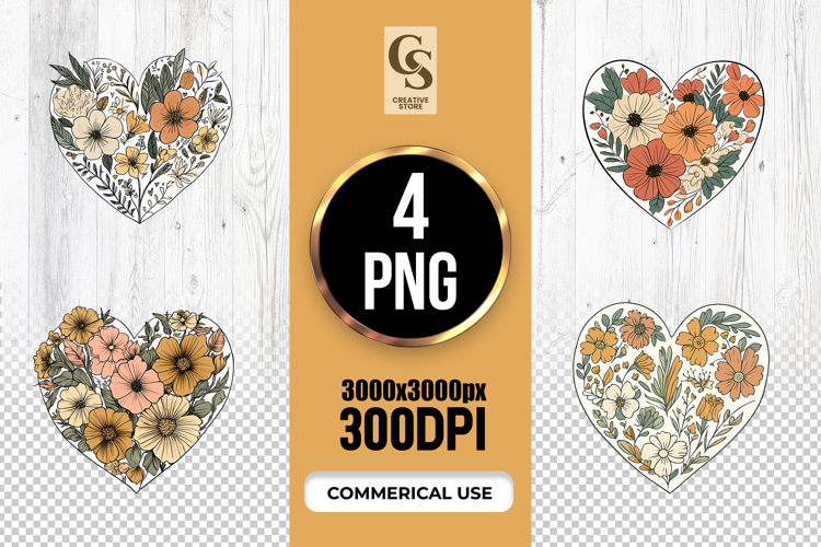 4 Floral Heart Botanical Clipart Sublimation PNG Files Perfect for Greeting Cards, Invitations, Junk Journal, Party Decor, Scrapbooking and many other craft projects.