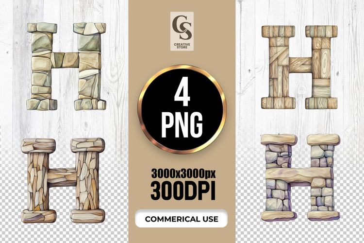 4 Stone Wood Letter H Alphabet Clipart Sublimation PNG Files Perfect for Greeting Cards, Invitations, Junk Journal, Party Decor, Scrapbooking and many other craft projects.