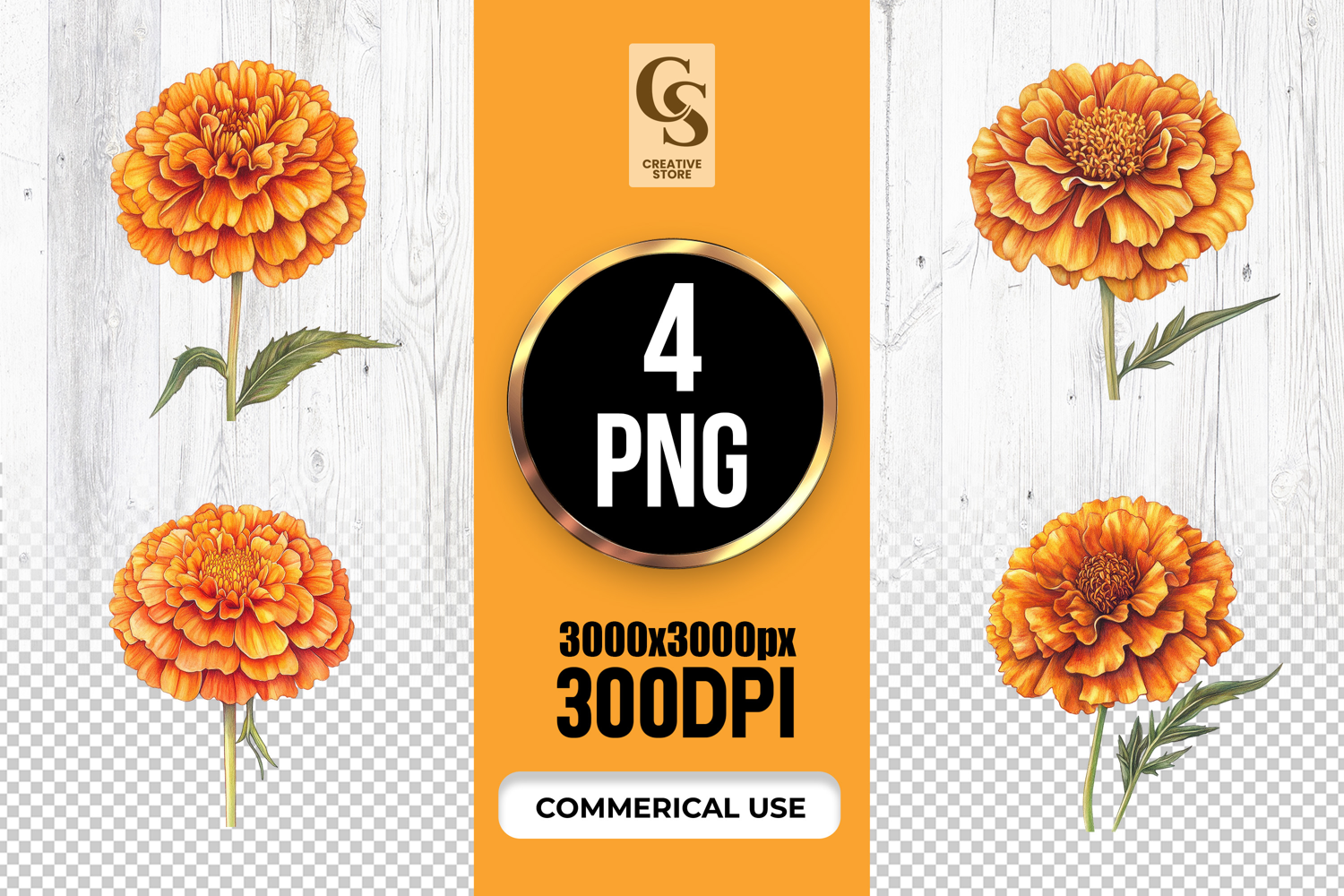 4 Orange Marigold Flower Botanical Clipart Sublimation PNG Files Perfect for Greeting Cards, Invitations, Junk Journal, Party Decor, Scrapbooking and many other craft projects.