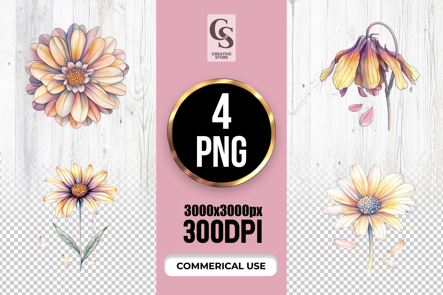 4 Pastel Daisy Floral Botanical Clipart Sublimation PNG Files Perfect for Greeting Cards, Invitations, Junk Journal, Party Decor, Scrapbooking and many other craft projects.