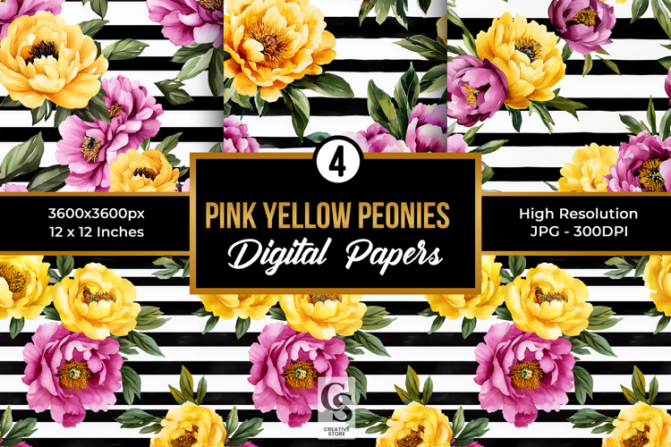 Digital Paper Spring Flowers Seamless Pattern Floral Background Peony Flowers Bold Stripes Pink Yellow Flowers Playful Floral Striped Floral Modern Peony
