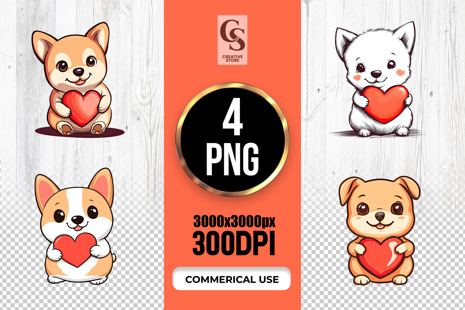 4 Cute Puppy Holding Heart Clipart Sublimation PNG Files Perfect for Greeting Cards, Invitations, Junk Journal, Party Decor, Scrapbooking and many other craft projects.