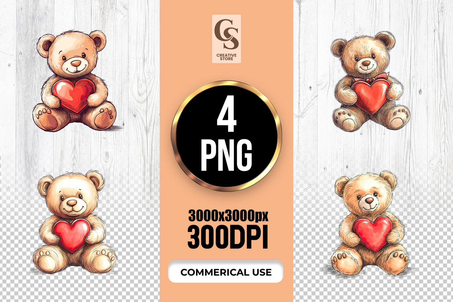 4 Cute Sitting Teddy Bear Heart Clipart Sublimation PNG Files Perfect for Greeting Cards, Invitations, Junk Journal, Party Decor, Scrapbooking and many other craft projects.