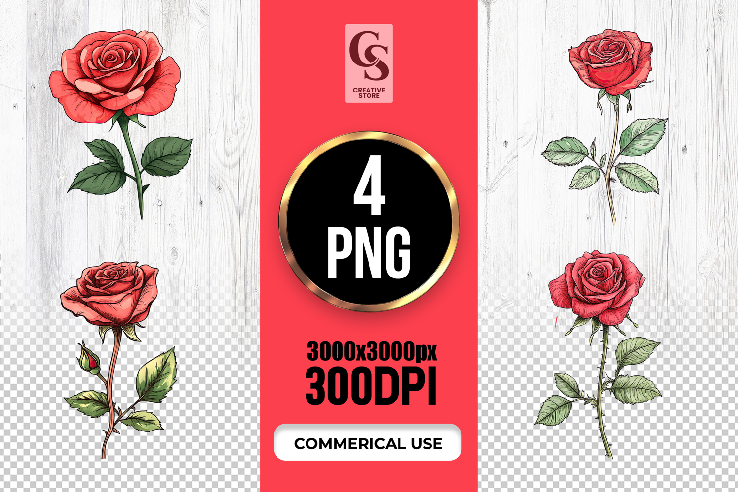 4 Red Rose Botanical Clipart Sublimation PNG Files Perfect for Greeting Cards, Invitations, Junk Journal, Party Decor, Scrapbooking and many other craft projects.