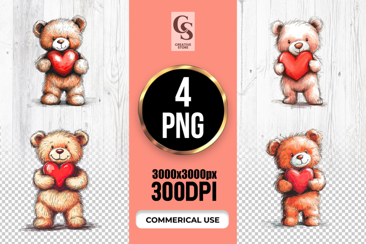 4 Cute Teddy Bear Holding Heart Clipart Sublimation PNG Files Perfect for Greeting Cards, Invitations, Junk Journal, Party Decor, Scrapbooking and many other craft projects.