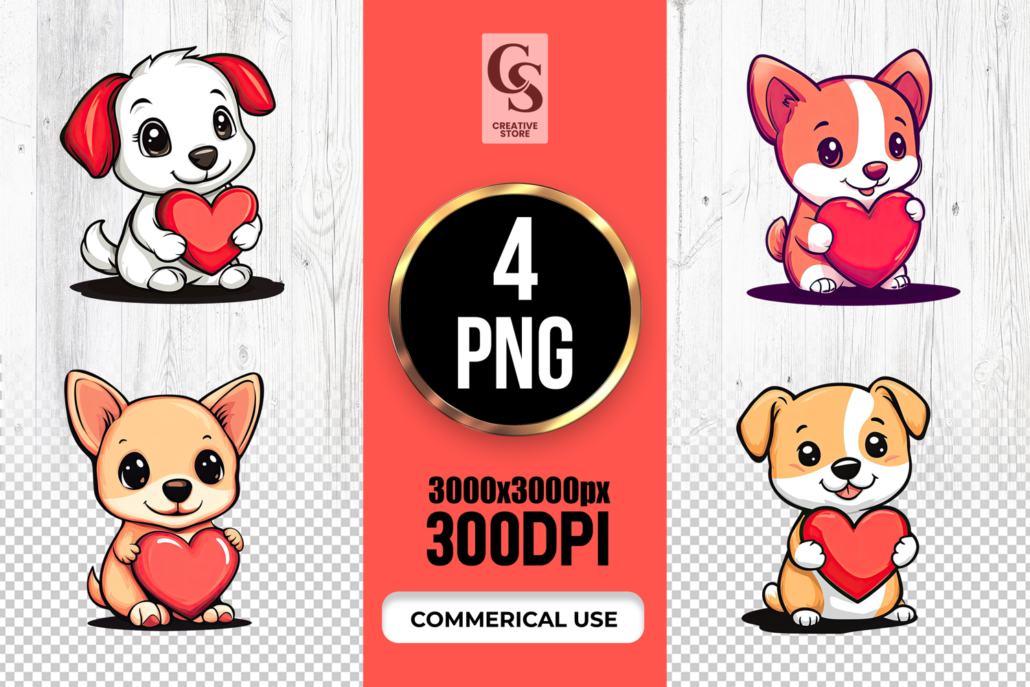 4 Cute Puppy Holding Heart Clipart Sublimation PNG Files Perfect for Greeting Cards, Invitations, Junk Journal, Party Decor, Scrapbooking and many other craft projects.