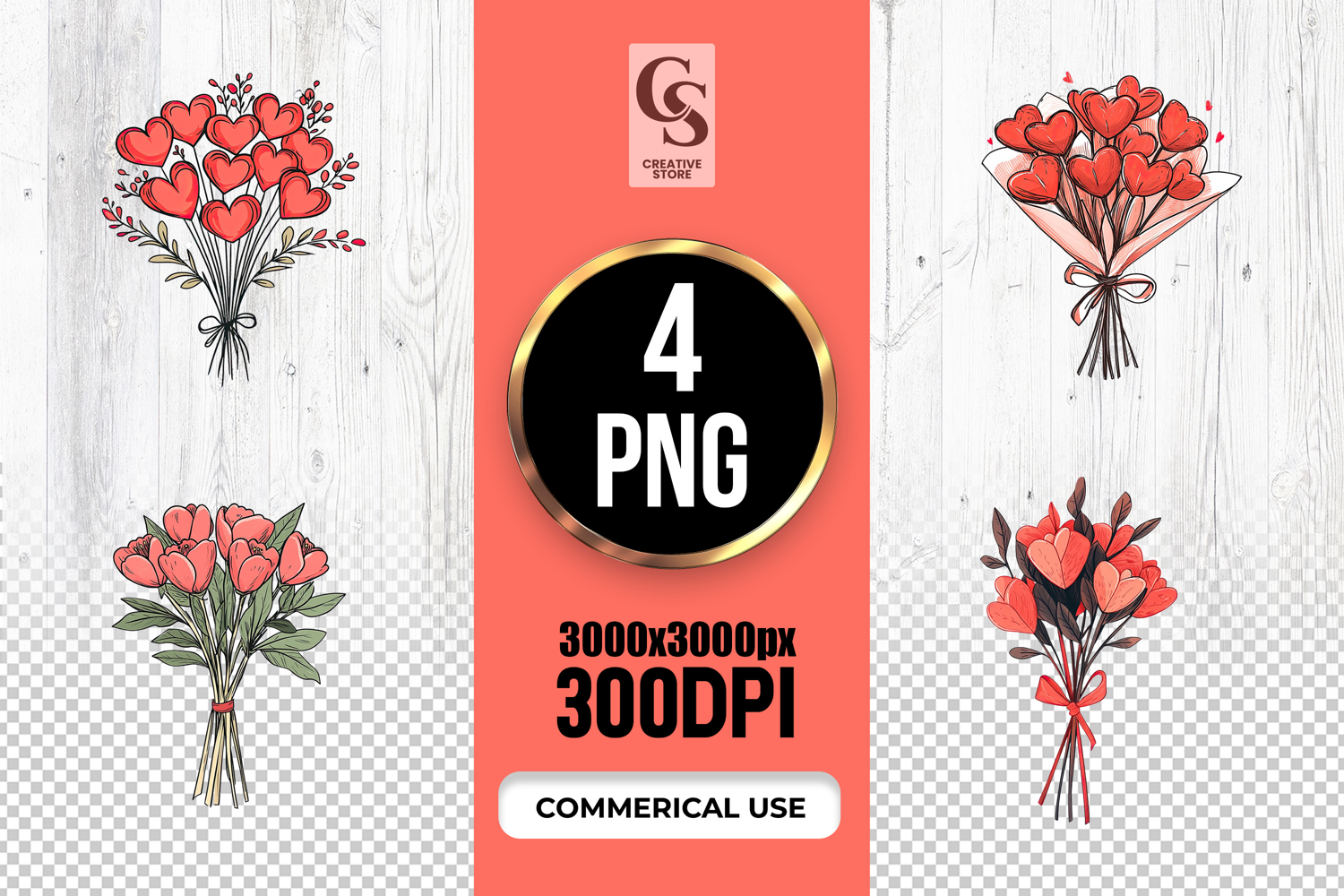 4 Heart Flower Bouquet Clipart PNG Files Perfect for Greeting Cards, Invitations, Junk Journal, Party Decor, Scrapbooking and many other craft projects.