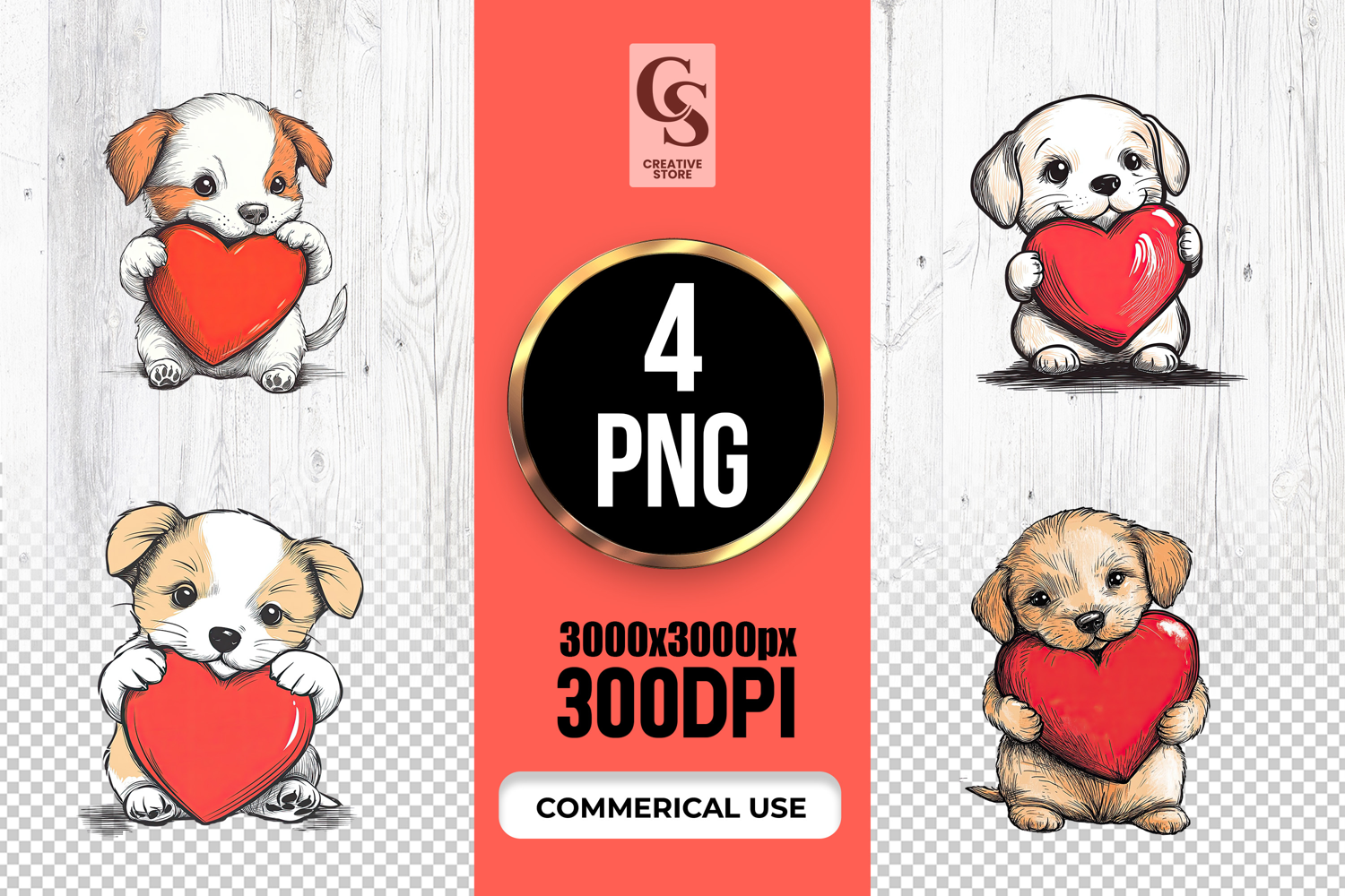 4 Cute Puppy Holding Red Heart Clipart Sublimation PNG Files Perfect for Greeting Cards, Invitations, Junk Journal, Party Decor, Scrapbooking and many other craft projects.
