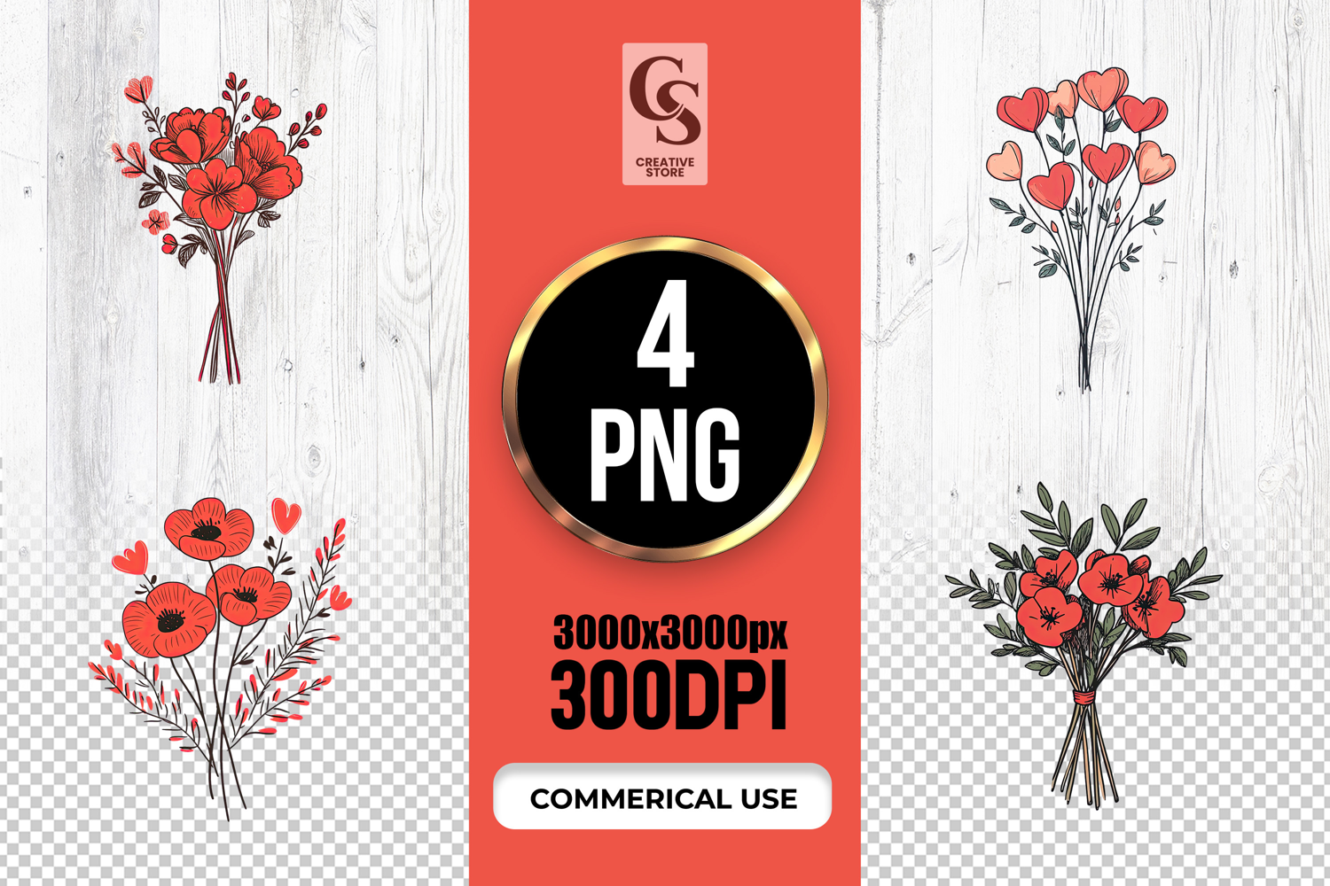 4 Red Poppy & Heart Floral Bouquet Clipart Sublimation PNG Files Perfect for Greeting Cards, Invitations, Junk Journal, Party Decor, Scrapbooking and many other craft projects.