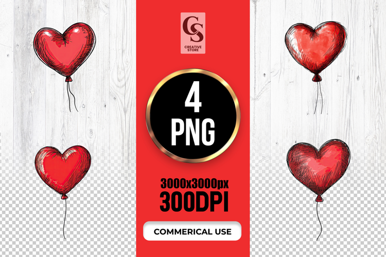 4 Hand-Drawn Red Heart Balloon Clipart Sublimation PNG Files Perfect for Greeting Cards, Invitations, Junk Journal, Party Decor, Scrapbooking and many other craft projects.
