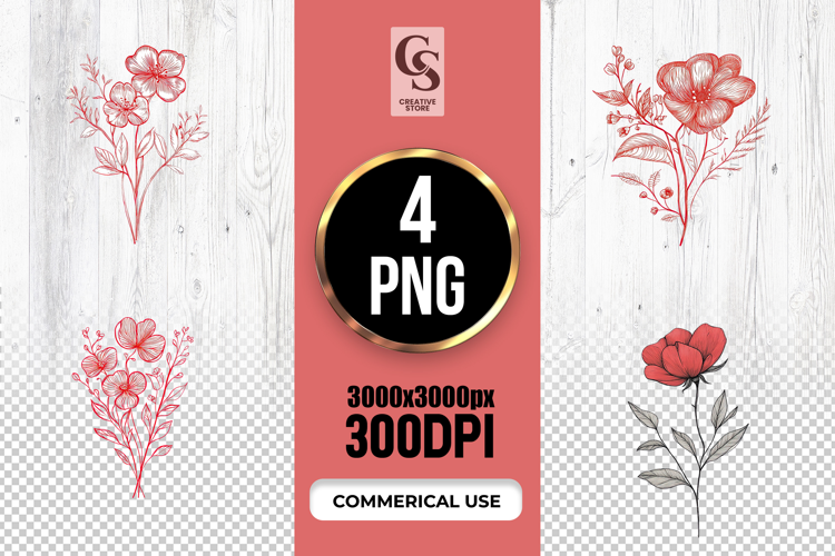 4 Red Line Art Floral Clipart PNG Files Perfect for Greeting Cards, Invitations, Junk Journal, Party Decor, Scrapbooking and many other craft projects.