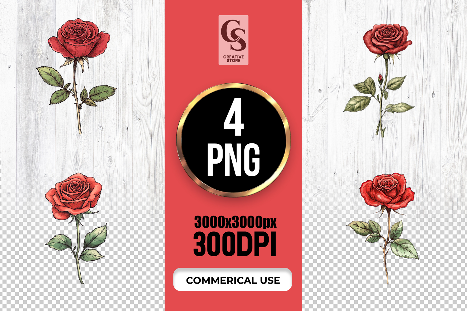 4 Red Rose Botanical Illustration Clipart Sublimation PNG Files Perfect for Greeting Cards, Invitations, Junk Journal, Party Decor, Scrapbooking and many other craft projects.