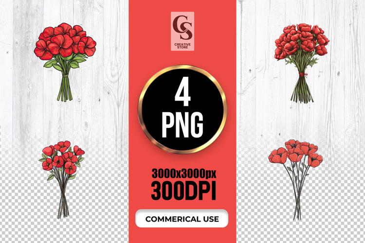 4 Hand Drawn Red Poppy Bouquet Clipart Sublimation PNG Files Perfect for Greeting Cards, Invitations, Junk Journal, Party Decor, Scrapbooking and many other craft projects.